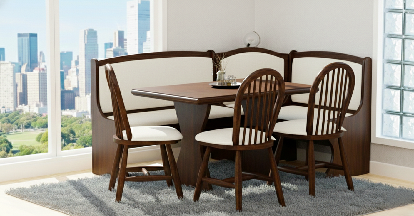 O Conjunto de Canto Alemão Frankfurt é todo produzido em madeira maciça, seus bancos contam com encosto e assento em tecido, as cadeiras em encosto ripado e assento em madeira acompanham almofadas em tecido. Perfeito para aquele espaço de canto, ele é fabricado com matéria prima de excelente qualidade, proporcionando resistência e durabilidade.
