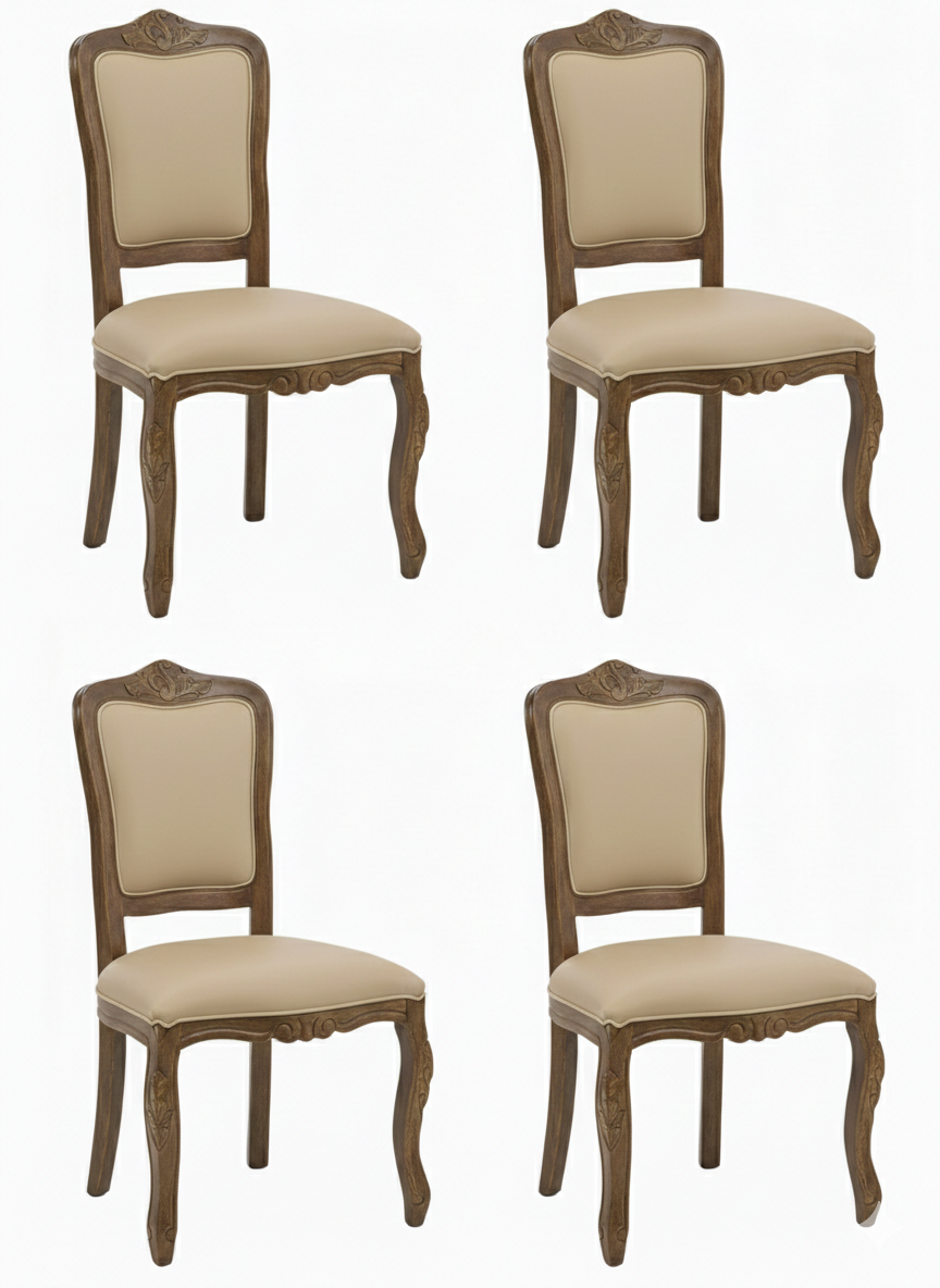 Este conjunto traz 4 cadeiras Luiz XV no acabamento imbuia envelhecido, unindo estilo clássico e sofisticação para ambientes de jantar. Com assento e encosto estofados em bege, oferece conforto aliado a design refinado.