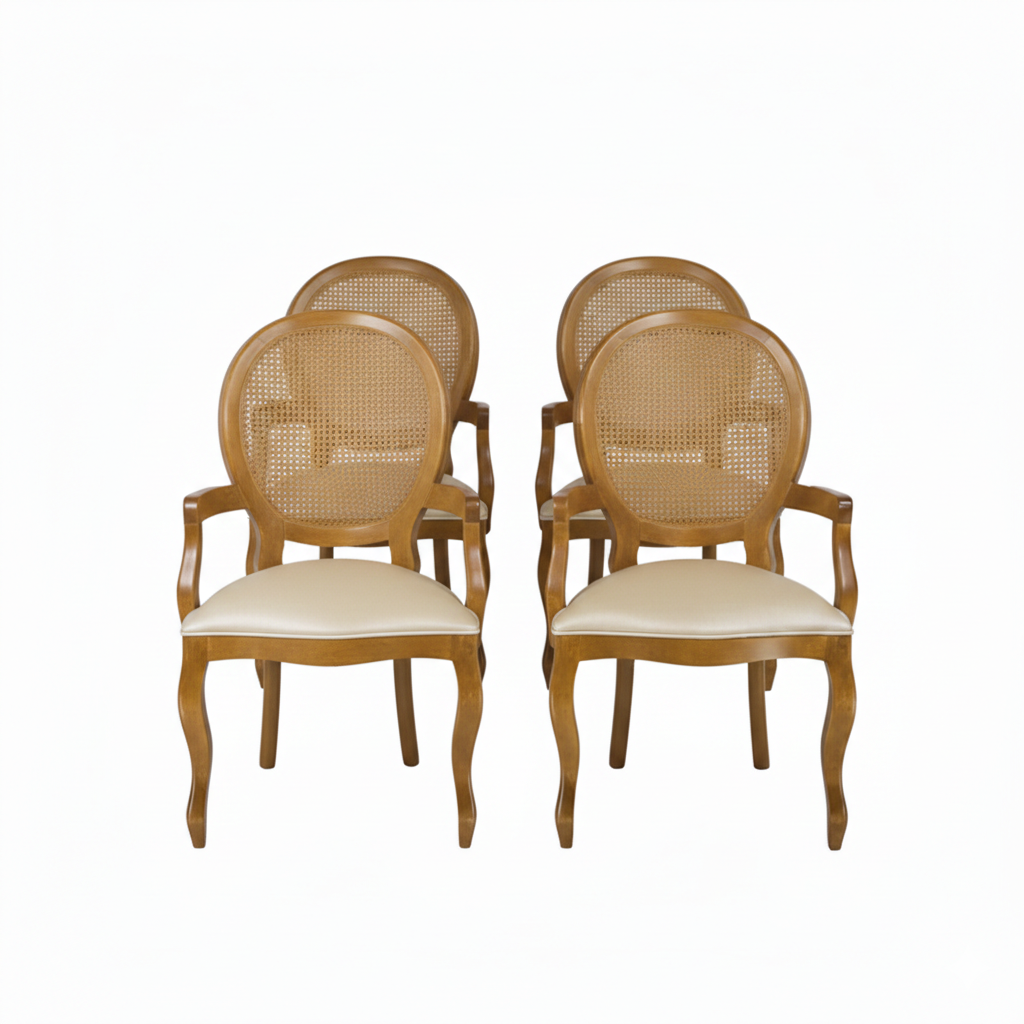 As cadeiras são produzidas com madeira maciça, o que aumenta a robustez e longa vida útil do móvel. O modelo medalhão possui encosto em palhinha, que além do charme, proporciona ventilação. O assento em tecido pérola traz suavidade e conforto para o uso diário, adequado para salas de jantar ou recepções.